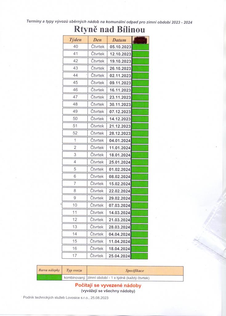 Čtvrtek 9. října 2025 - zahájen zimní svoz směsného komunálního odpadu pro rok 2025 /1x týdně do 30.4.2026/